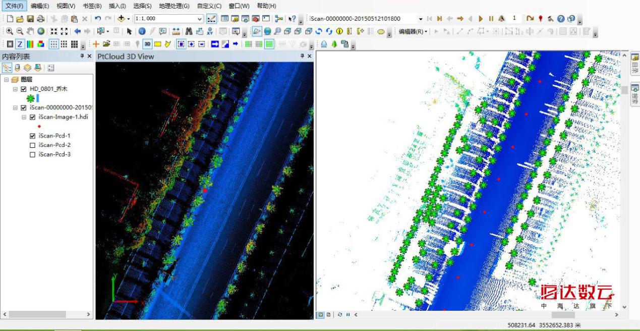 三維激光移動測量系統(tǒng)可以在快速行駛過程中采集道路兩邊三維激光點云和全景影像數(shù)據(jù),隨著全景激光移動測量方式的發(fā)展和推廣應(yīng)用,可以解決沿道路兩旁行道樹數(shù)據(jù)的快速獲取問題,再通過內(nèi)業(yè)自動化及人工交互作業(yè)方式,快速提取城市園林專題矢量要素,大大降低外業(yè)作業(yè)勞動強度,同時降低生產(chǎn)成本。