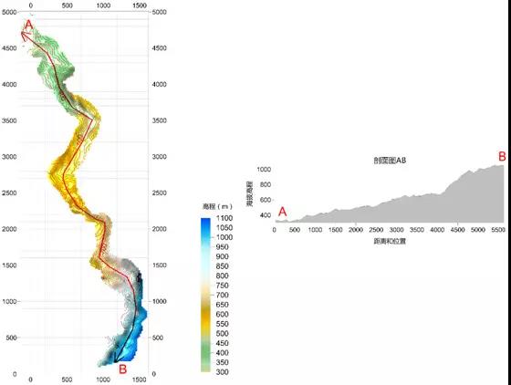 西部某山地測區(qū)(如圖1),面積約2平方公里,南北高差達700米;測區(qū)內(nèi)僅有一條寬約3米的沙石路,道路一側為山坡,另一側為懸崖;其中一段直線路徑,距離不到600米而高差卻超過了500米。此外,測區(qū)內(nèi)灌木叢生、喬木林立,用傳統(tǒng)常規(guī)方法很難在短期內(nèi)完成測繪作業(yè),且成果精度難以保證。